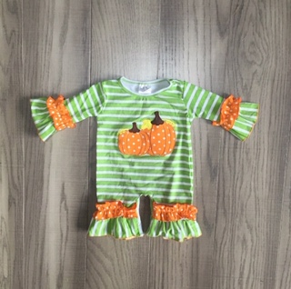 Green/White striped romper with orange ruffle detail at sleeves and legs. Polka dot pumpkins decorate the front of the romper. What an adorable outfit to have your little peanut wear through the fall season! 100% cotton. Recommended to hang dry.